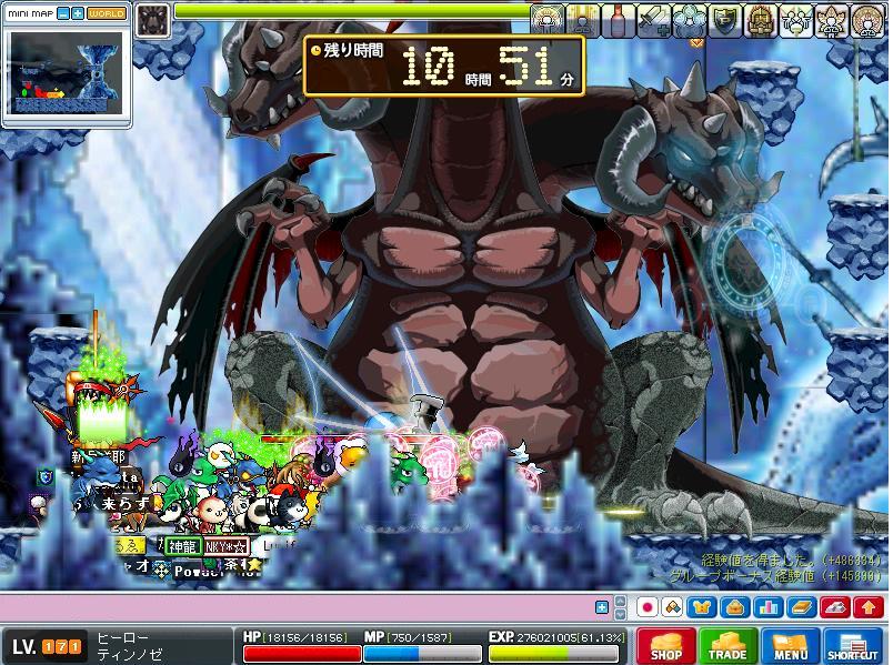 相当時間掛かります、330mですもの。しかも物理無効もしてきます、がしかし1でも殴り続けますみんな 根性ですね。防御upのスキルを使ってくるので、HRでアーマークラッシュに振っていれば使ってみるのもいいでしょう、自分も10振っているので何度か解除してみました、初めて役に立ったよ・・・ネタスキル まぁ気休めでもやらないよりマシってことで。