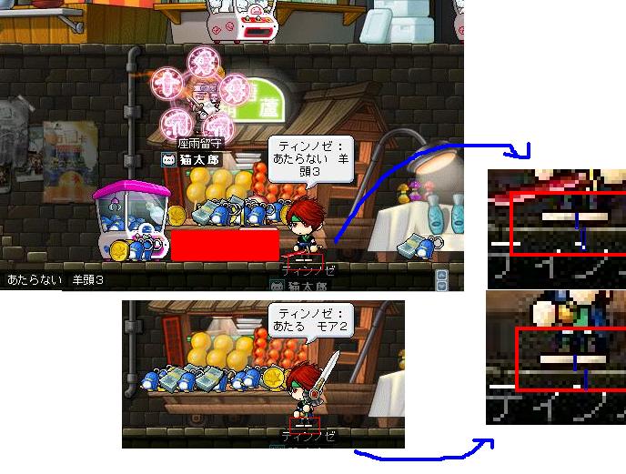 結局のところ みんな同じ射程でした 拡大した画像の青い印は 足の真ん中の線と 地面のブロックのつなぎ目の線です。 がんばってこれを少しずつずらして←にわくペンギンがちゃを殴るわけです。